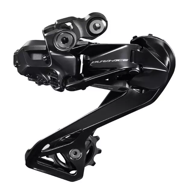 Ce nouveau dérailleur arrière Shimano Dura Ace présente une partie de sa chape en carbone pour gagner en rigidité et diminuer son poids. Il permet l'utilisation d'une cassette avec une denture maximale de 34 dents.